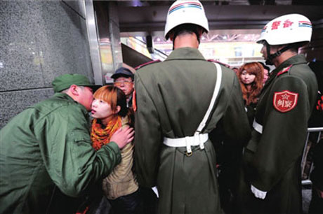 一名新兵與家人耳語(yǔ)道別。10日下午,北京今冬第一批450名新兵在北京西站啟程,乘坐T579次列車(chē)奔赴石家莊等地軍營(yíng)。張斌 攝(圖片來(lái)源:京華時(shí)報(bào))