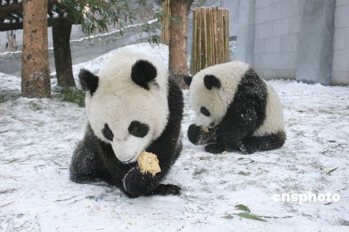 2006年1月,臥龍降雪團(tuán)團(tuán)圓圓玩滾雪球。中新社發(fā) 衡毅 攝