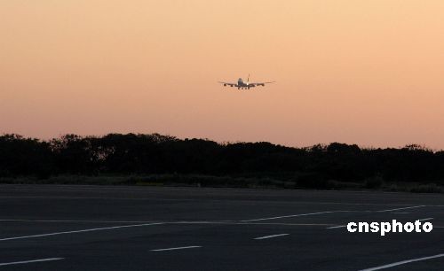 臺灣長榮航空運送大陸贈臺大熊貓“團團”、“圓圓”的專機,在晚霞的映襯下平穩順利降落在臺灣桃園機場。