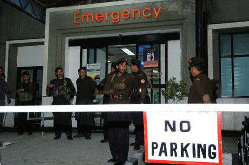 12月24日,在巴基斯坦首都伊斯蘭堡,軍警在收治受傷中國工程人員的醫院急診室外把守。李敬臣 攝
