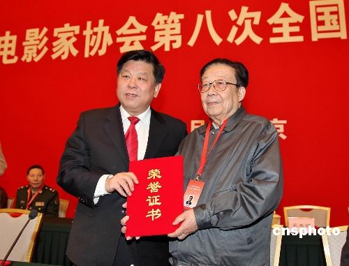 中國文聯(lián)黨組書記胡振民給著名導演謝鐵驪頒發(fā)榮譽證書。