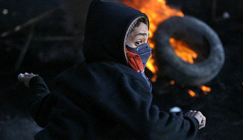 圖:巴勒斯坦男孩向以色列士兵投擲石子