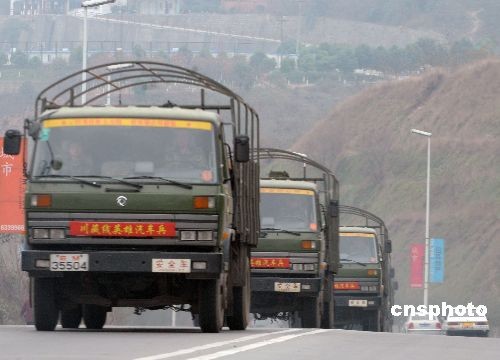 2008年終前,成都軍區(qū)抗震救災(zāi)部隊冒著余震重返災(zāi)區(qū),每天出動一千多輛軍車向北川、汶川、綿陽、安縣、江油等地震重災(zāi)區(qū)運輸重建家園急需的磚頭。中新社發(fā) 賈國榮 攝