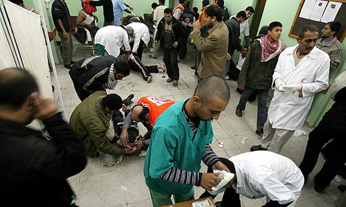 12月29日,在加沙地區北部的一家醫院,巴勒斯坦傷員躺在地板上接受醫護人員的治療。 由于以色列對加沙地帶的持續封鎖,加沙醫院的醫療條件非常惡劣。空襲造成的大量人員傷亡讓加沙醫院幾乎面臨崩潰。