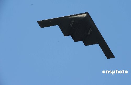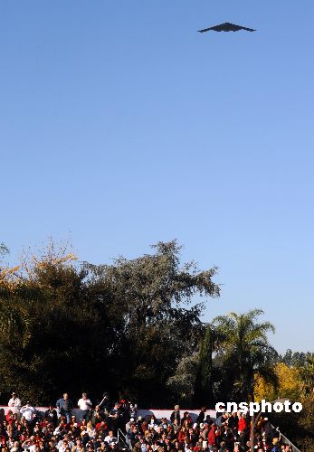 圖為一架美國空軍B-2隱形轟炸機掠過游行隊伍上空,為本屆花車游行助興。中新社發 張煒 攝