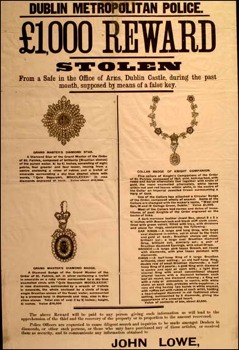 19世紀愛爾蘭國王威廉五世收集了很多珠寶——綠寶石、紅寶石、鉆石,這些珠寶都被安全地放置在都柏林城堡的貝德福德塔里,由阿爾斯特軍事首腦、他的外甥及兩名助手保管。1907年6月18日,教區(qū)牧師稱塔的大門鑰匙不見了。5天之后,一名清潔工在她工作時發(fā)現(xiàn)大門是開的。接著在7月6日,她又發(fā)現(xiàn)了更奇怪的事情:裝滿珠寶的金庫大門在整晚是敞開的。那天下午,牧師和威廉五世的外甥檢查黃金并為圣帕特里克(愛爾蘭圣徒)的領子裝飾珠寶,這時一位門童進來,牧師將鑰匙交與他并讓他完成剩下的珠寶鑲嵌,一分鐘之后,當牧師再次回到金庫時,他發(fā)現(xiàn)所有的珠寶都不見了!