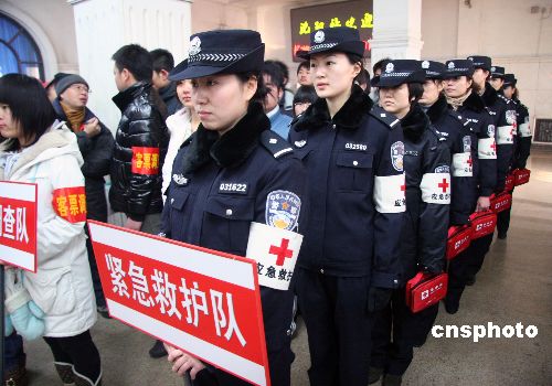 2009年1月7日,在沈陽站候車室8名身佩紅十字袖標英姿颯爽的沈鐵公安紅十字應急救護隊的女警正式上崗,這是全國鐵路公安機關第一支專業應急救護隊伍。中新社發 趙敬東 攝