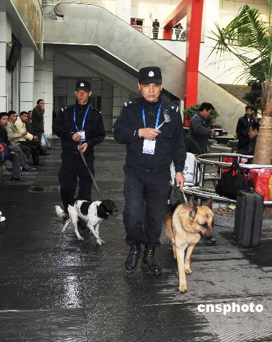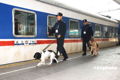 2009年1月8日上午,廣州火車站民警帶著搜爆犬在站臺上巡邏。去年12月開始,廣州鐵路警方提前進入春運安全保衛(wèi),并啟用4條搜爆犬24小時在廣州火車站搜爆,確保春運安全。