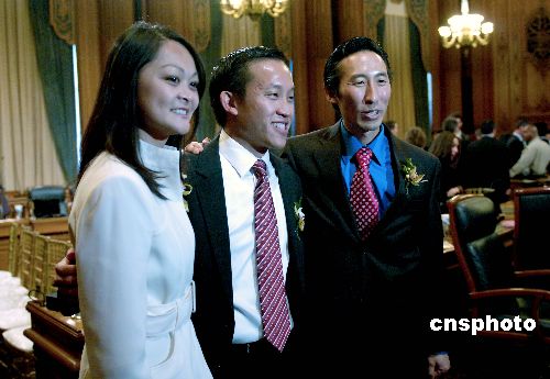 當地時間一月八日,舊金山市議會當選議員宣誓就職,并選舉出舊金山歷史上首位華裔議會主席邱信福。舊金山市歷史上首次同時出現三位華裔議員邱信福(中)、朱嘉文(左)和馬兆光。圖為三位華裔議員宣誓后合影。中新社發 陳鋼 攝