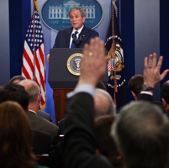 習慣為別人取外號的布什在一開始就稱今天的記者會為“最終臨別采訪”,并對八年來一直在白宮報道他的白宮常駐記者們表達了充分的感謝。