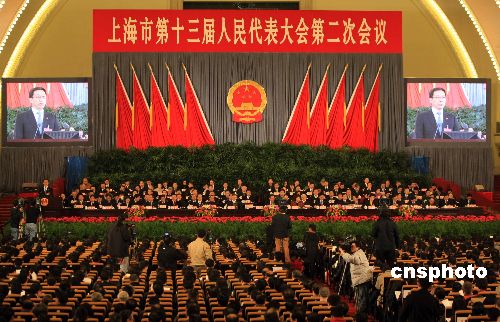 一月十三日上午九時,上海市第十三屆人民代表大會第二次會議在上海展覽中心中央大廳開幕。上海市長韓正代表市政府向大會作政府工作報告。中新社發 湯彥俊 攝