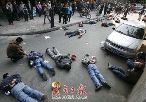 2009年1月13日上午10時30分許,記者在抓捕現場看到,廣東佛山禪城區城巴總站出站口有20名被控制住的嫌疑人橫七豎八地躺在地上。 張由瓊 攝