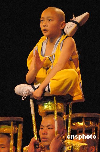 十歲小武僧身輕如燕,躍上由眾多師兄腦袋組成的“梅花樁”,有限的空間里表演少林童子功無限的招式。中新社發 楊洋 攝