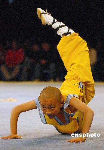 圖為少林小弟子表演一種新的拳路—少林象形拳之蝎子拳。中新社發 劉冉陽 攝