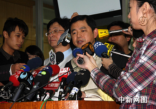 1月19日,臺北地方法院首次開庭審理前臺灣地區領導人陳水扁家弊案。傳訊陳水扁到地院準備程序庭。圖為庭審后陳水扁委任律師鄭文龍(左三)、石宜琳(左二)舉行記者會。中新社記者 陳立宇 攝