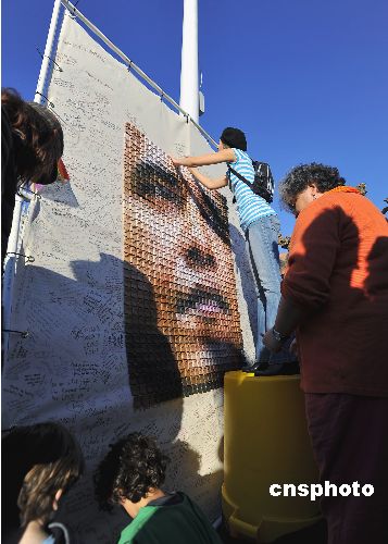 圖為觀眾在一個由紙鶴組成的奧巴馬總統像上簽名,表達和平心愿。