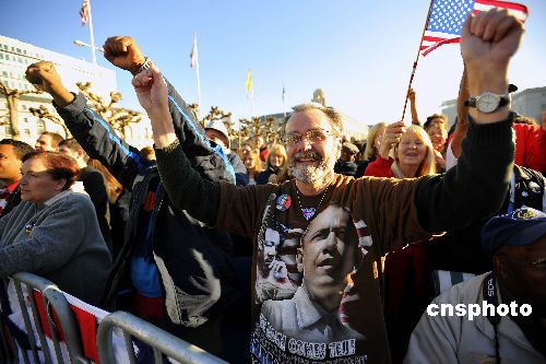 圖為舊金山人歡慶奧巴馬就職美國總統。中新社發 陳鋼 攝