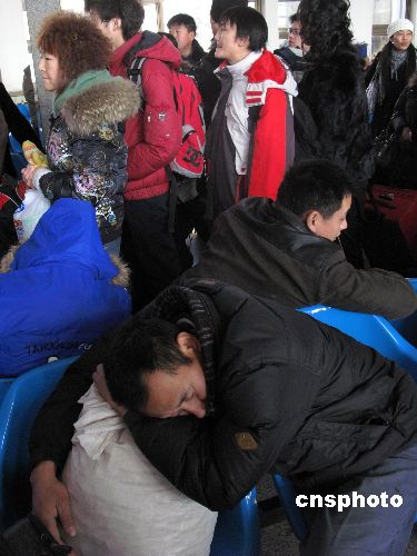1月23日,一批批的旅客從北京站登車回鄉過農歷已丑年(牛年)的春節。一名辛苦一年的壯年民工,在候車大廳等車中,提早進入了新春的夢鄉。為回鄉過農歷已丑年(牛年)的春節,許多在北京的旅客,早早離開臨時居所,在車站休息。當日是中國春運第13天,中國客流最高峰已經到來,中國鐵路共開行臨客754列,其中直通臨客393列。中新社發 鄒憲 攝