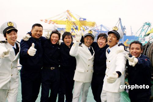 江蘇籍貫的“振華4號”船員斗志昂揚地在甲板上向江蘇家鄉父老歡呼。中新社發 李根 攝