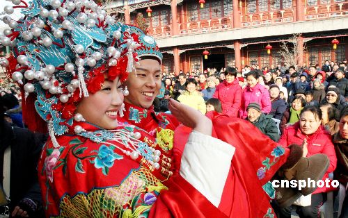 1月27日 (大年初二),北京大觀園十四屆紅樓廟會吸引眾多假日游客,本屆廟會以弘揚中華傳統文化為宗旨,以展現紅樓文化為主題,呈現出改革開放30年來新北京、新宣武的精神風貌。廟會主要活動有“元妃省親”、“寶黛成婚”“賈母賀壽”、紅樓文化展覽--木版年畫展、紅樓夢人物火花展以及紅樓美食展示區等。圖為在北京大觀園2009年紅樓廟會上別具創意的“寶黛成婚”。中新社發 錢興強 攝
