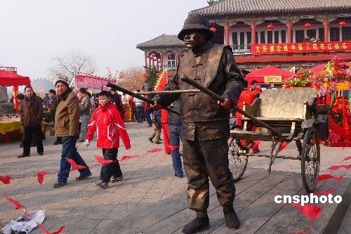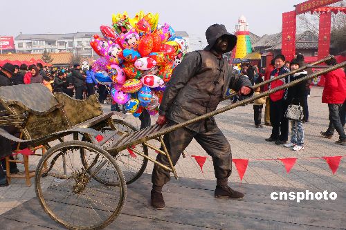 1月30日,河南省開封市翰園碑林里布置的真人活體雕塑引來不少游人駐足觀看。春節期間,河南省開封第十屆翰園春節祭祖大廟會上推出不同造型的真人活體雕塑,逼真的藝術效果讓人耳目一新。