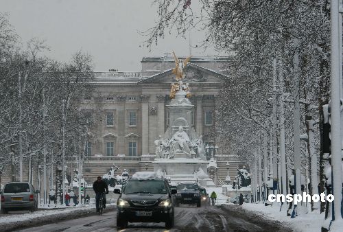 英國自1日下午起開始降雪,至2日早晨已經成為十八年最嚴重的暴雪。惡劣天氣使公共交通陷入停頓或癱瘓,首都倫敦的公交車停駛,地鐵線也陷入混亂狀況。圖為大雪中的英國王宮白金漢宮。