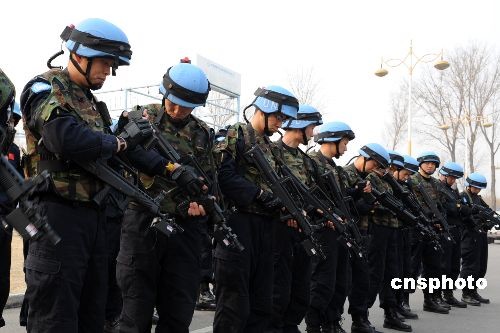 維和防暴隊員進行激光模擬戰斗前準備。中新社發 由永懷 攝