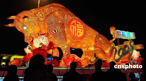 2月8日晚上,浙江杭州各文化廣場的“牛”燈都亮起來了,吸引了眾多市民前來觀看。中新社發 引煒 攝