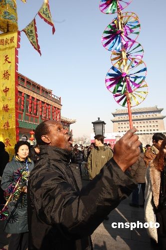 元宵節來臨,北京前門大街舉行民間花會踩街活動,一名外國觀眾手舉風車玩得很過癮。踩街是一種中國傳統民間民俗藝術表演形式,類似國外的花車游行,表演隊伍邊行進邊表演,百姓沿途觀看。中新社發 杜洋 攝