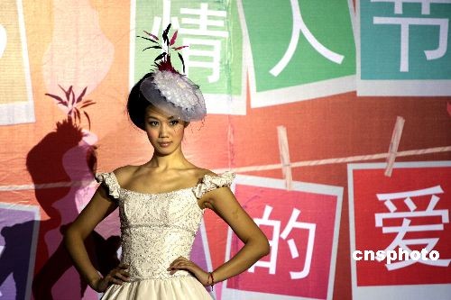 2月13日,情人節(jié)前夕,各商家紛紛想出辦法緊抓商機(jī)。某商家在商場內(nèi)為情人們奉獻(xiàn)上一場婚紗展,此展覽將持續(xù)三天,模特每天將分時(shí)段在商場T臺(tái)上為顧客展示多樣婚紗。中新社發(fā) 富田 攝