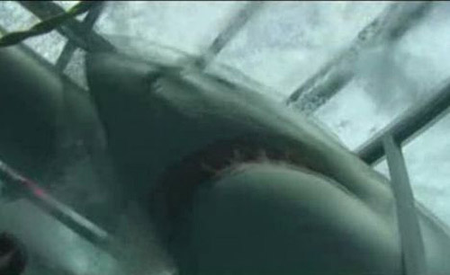 這一令人驚恐的事件是在兩名潛水者參加旅游公司所組織的“極限鯊魚深潛體驗(yàn)游”時(shí)發(fā)生的,他們當(dāng)時(shí)正在觀看那頭體重達(dá)2噸的大白鯊捕食金槍魚。一頭長4.5米的大白鯊?fù)蝗幌蚪饘傧溆蝸恚蟀柞彽念^部穿過了鐵欄桿,將鐵欄桿撞斷,兩名潛水者不得不趕緊逃生。