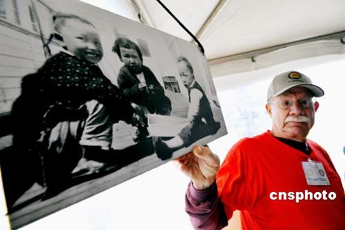 圖為志愿者在展示一張被羈留的中國兒童移民在此生活的歷史照片。