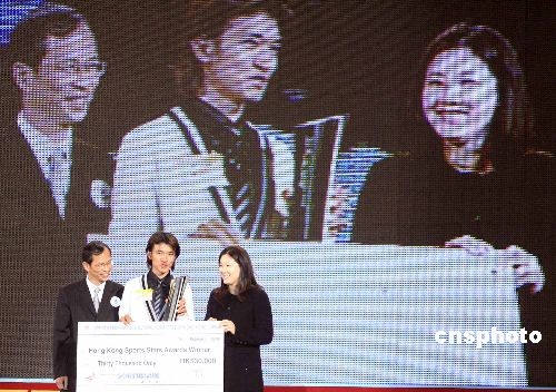 二月十六日,“2008中銀香港杰出運動員選舉”得獎結果在香港會展中心舉行的頒獎典禮上揭曉。圖為香港特區立法會主席曾鈺成與伏明霞為香港杰出運動員黃金寶頒獎。中新社發 張勤 攝