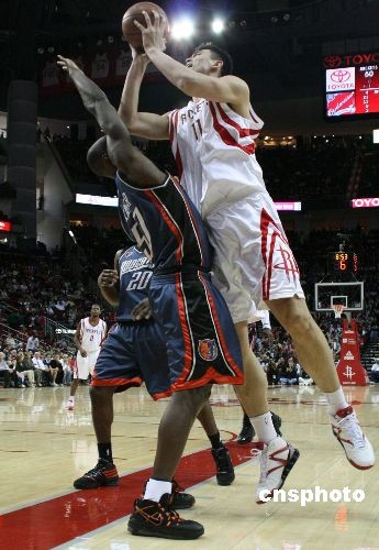 火箭隊2月22日在休斯頓主場以99-78輕取山貓,本賽季第二次取得四連勝。姚明上場36分鐘,拿下19分、7個籃板和2個蓋帽。圖為姚明強行突破上籃。中新社發(fā) 歐文 攝