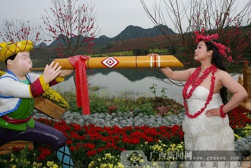 前來參加2009花花大世界舉辦的山水桃花節(jié)之“芙蓉舞桃花、山水也動容”的網(wǎng)絡(luò)紅人芙蓉姐姐身著白紗公主裙,在桃花叢中擺出經(jīng)典的S造型,并許下桃花愿,要尋找一位“壯壯的,心地善良的阿牛哥”陪伴其終身。