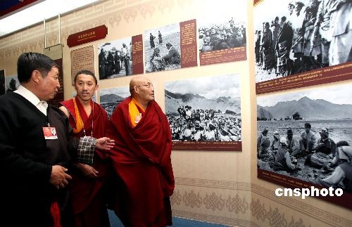 3月11日,參加全國政協會議的宗教界委員參觀在北京民族宮舉辦的西藏民主改革50年大型展覽。中新社發 傅丹丹 攝