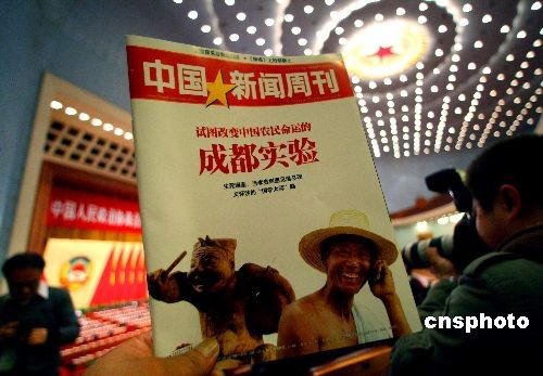 3月3日至13日,全國“兩會”在北京人民大會堂召開,與會人員在會前關注《中國新聞周刊》。中新社發 宋吉河 攝
