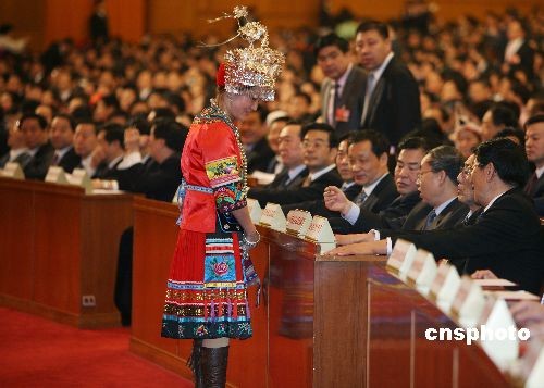 3月13日上午,第十一屆全國人民代表大會(huì)第二次會(huì)議在北京人民大會(huì)堂舉行閉幕會(huì)。會(huì)前,來自重慶的苗族女代表李小燕逐一請坐在前排的各省省長們在紀(jì)念冊上簽名。中新社發(fā) 任晨鳴 攝