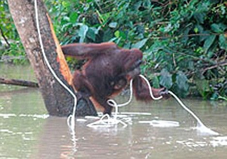 馬來西亞婆羅洲島東北端的一條河流不久前發生了洪水,一只紅毛猩猩媽媽和她的幼子被困在樹上進退兩難,它們已被困在那里好幾天了。世界自然基金會派遣一個救援小組前往該地區,搭建了一個索橋,使他們能夠靠近這對饑餓的猩猩母子。救援人員想出了一個妙招,他們將一根繩子扔給猩猩媽媽,希望她能抓牢這根繩子游到最近的岸上。但是救援人員十分擔心,猩猩媽媽會因為怕水拒絕抓住繩子游到岸邊。出人意料的是,母猩猩從樹上爬下來,背著孩子毫不猶豫地跳進洶涌的洪水中,她手里抓著繩子,并確保猩猩幼子的頭部露在水面上,奮力游向河岸,終于安全到達岸上。