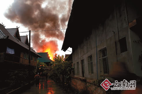 與此同時,發現房屋起火的村民也跑到村寨辦公室,用高音喇叭通知村民趕來救火。等玉溫接到兒媳電話趕回來時,大火已經燒得通紅,現場趕來的數十名村民已經開始用臉盆和水桶接水救火了。隨后趕來的公安民警、以及從遠處的曼春滿、曼聽等村寨趕來的村民也紛紛加入到了救火隊伍中。