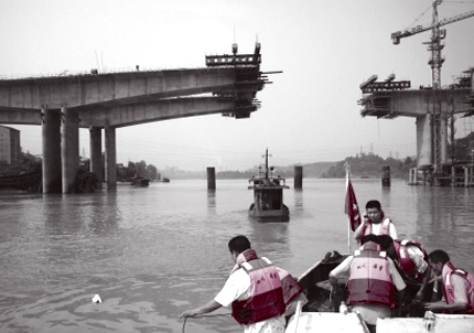 經(jīng)過10分鐘的航行,兩艘打前站的探摸船只從上游進入出事水域。只見寬近300米的河面上,正中矗立著四根數(shù)十米高的橋墩,上面的橋面才剛剛建設(shè)。