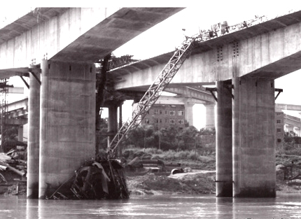 “啊,河中間的棧橋也不見了!”等李師傅走到才建了半截的大橋邊時,眼前的一幕更讓他吃驚:州河正中靠右側(cè)80多米長、用鋼架和扣件搭建的棧橋,被洪水硬生生地從兩個大橋墩中間沖斷了,只留下3個棧橋橋墩。右岸橋下的幾十米棧橋也被沖得扭曲變形,一頭栽在洪水中。
