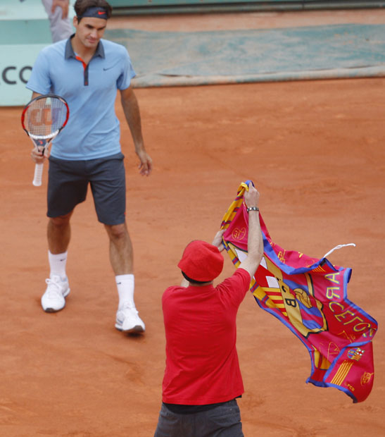法網(wǎng)男單決賽場上,一位費(fèi)天王的癡心球迷沖入球場,強(qiáng)行將自制的一頂帽子戴到費(fèi)德勒的頭上。安保人員及時出現(xiàn),將狂熱粉絲架出場外。