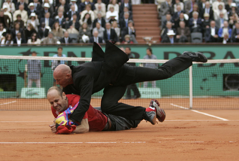 法網男單決賽場上,一位費天王的癡心球迷沖入球場,強行將自制的一頂帽子戴到費德勒的頭上。安保人員及時出現,將狂熱粉絲架出場外。