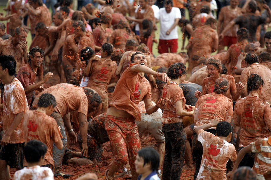 2009年6月14日,哥倫比亞第五屆番茄狂歡節開幕,參與者互相投擲西紅柿,盡情狂歡慶豐收。來自哥倫比亞各地的狂歡者們云集在首都波哥大東北部的蘇塔馬錢小鎮,街道上立刻變成了西紅柿紛飛的戰場。雖然每個人的臉上身上沾滿了西紅柿汁,但人們還是樂此不疲又是丟又是砸,把成堆的西紅柿當成打仗的“武器”。還有人特地穿上白衣白褲,身上越紅,心里就越痛快。