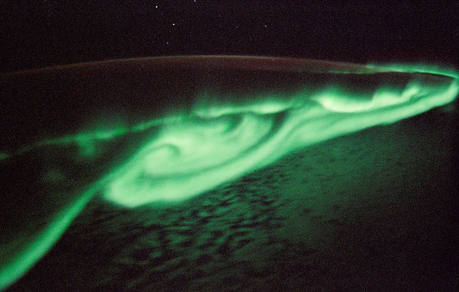 在兩極上空大氣層以上數十公里的太空,極光現象仍能被清楚地觀測到。紅色、綠色的極光閃爍著怪異的微弱綠光,好似鬼怪之光,給人以寒冷的感覺。在繞地軌道上的宇航員用長曝光相機和35毫米膠片拍攝下了這些怪異的圖片。