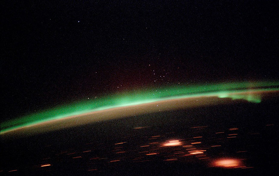 在兩極上空大氣層以上數十公里的太空,極光現象仍能被清楚地觀測到。紅色、綠色的極光閃爍著怪異的微弱綠光,好似鬼怪之光,給人以寒冷的感覺。在繞地軌道上的宇航員用長曝光相機和35毫米膠片拍攝下了這些怪異的圖片。