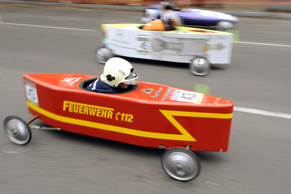 6月28日,德國柏林的德比郡舉行了第50屆“肥皂盒”競速賽車,該賽車沒有動(dòng)力裝置,參賽者親手打造的“賽車”更使比賽妙趣橫生。