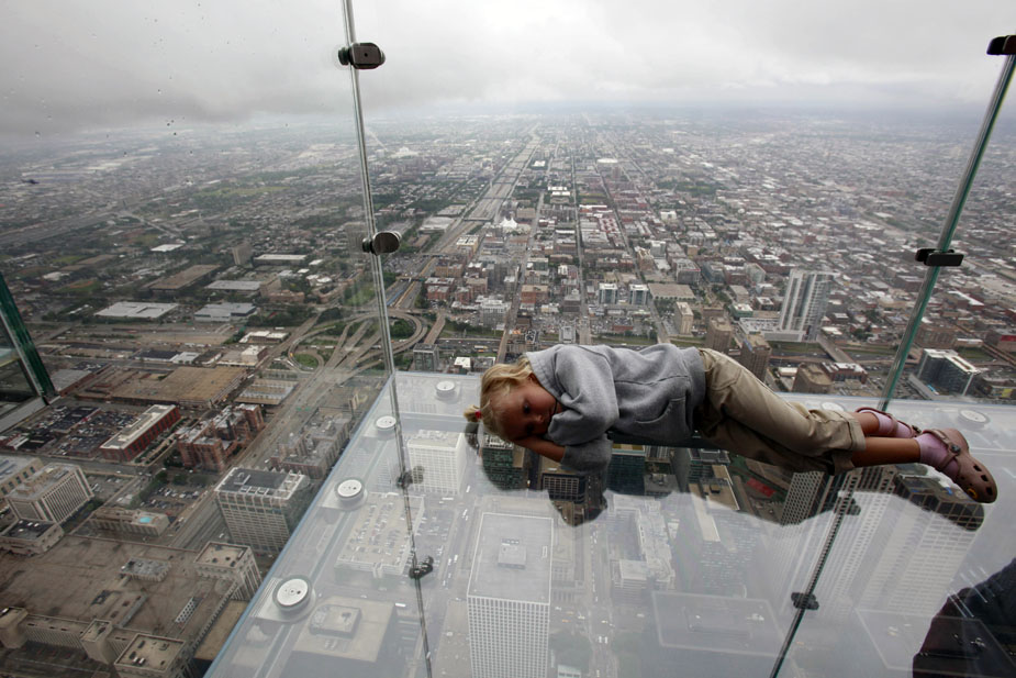7月1日,美國芝加哥,西爾斯大廈在第103層瞭望臺增設的玻璃陽臺對媒體開放。這些玻璃陽臺建在大廈西側,從瞭望臺向外延伸約1.2米。陽臺的玻璃地板厚達12.7厘米,可承重約5噸。