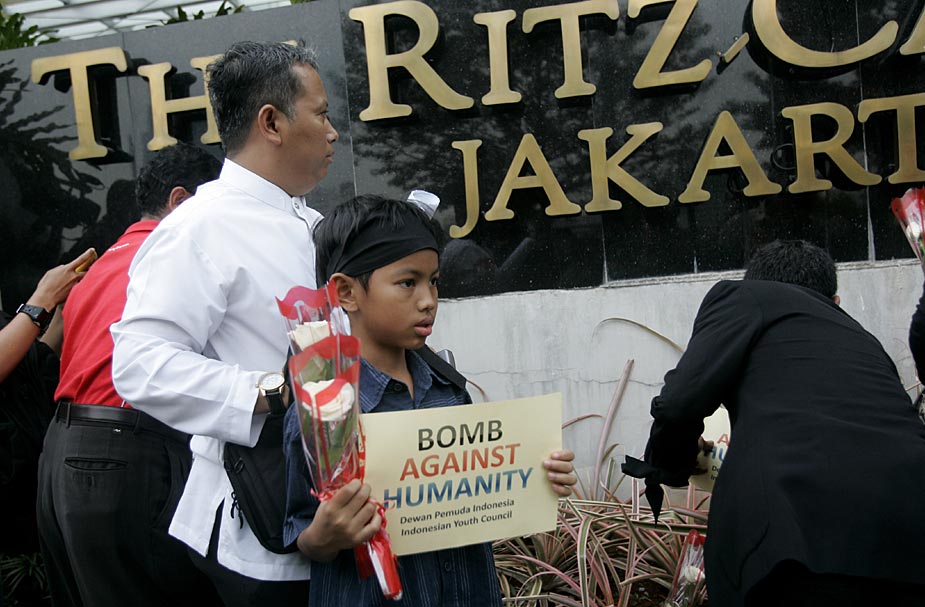 7月18日,印度尼西亞首都雅加達的民眾紛紛來到發生爆炸的萬豪酒店和麗嘉酒店,向死難者獻花表示哀悼。